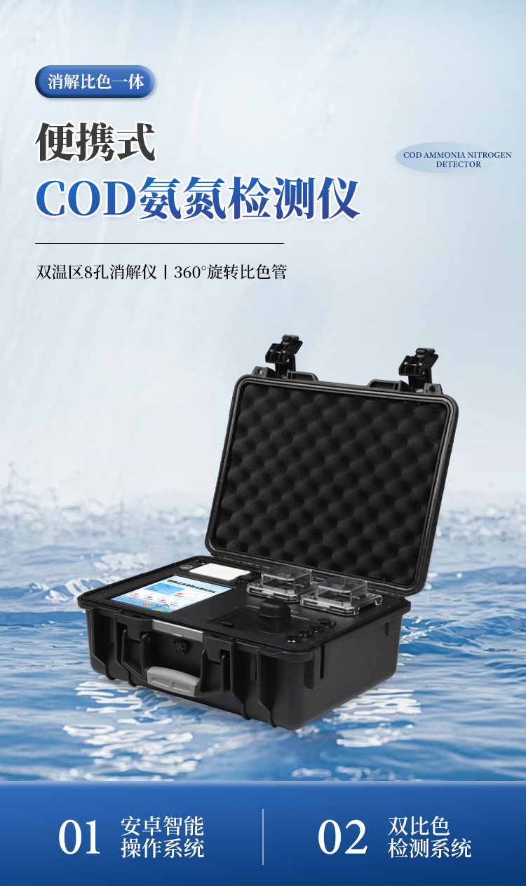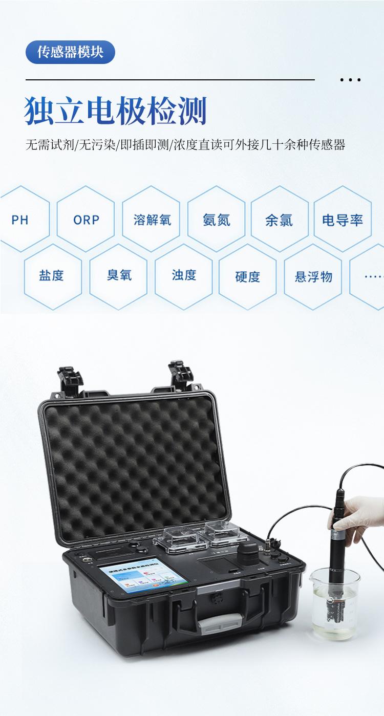 简要描述: 一、设备简介:便携多参数水质检测仪一台仪器集成两种快速检测原理方法(分光法和电极法),采用高强度PVC工程塑料手提箱设计,消解检测一体式设计,其中消解模块具备双温区功能,检测