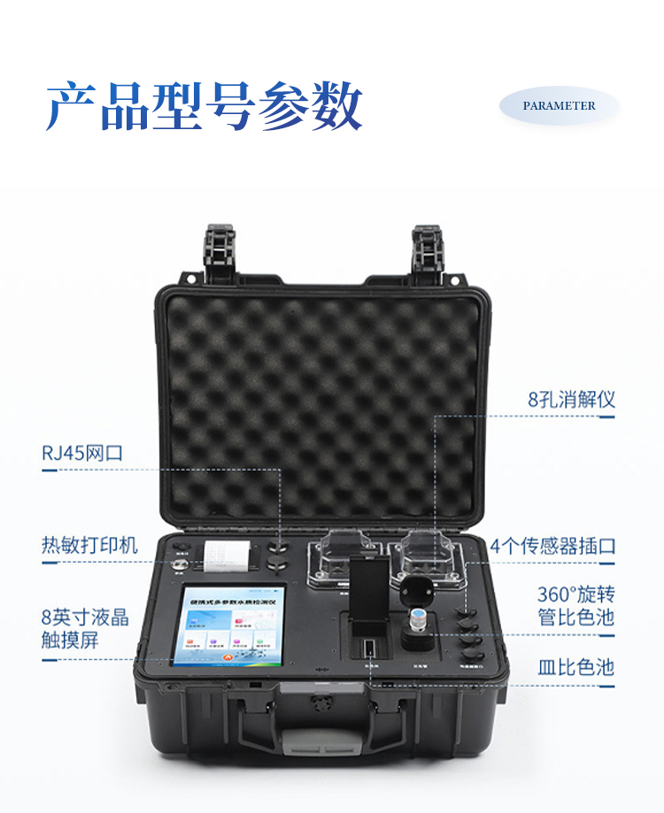 便携多参数水质检测仪一台仪器集成两种快速检测原理方法(分光法和电极法),采用高强度PVC工程塑料手提箱设计,消解检测一体式设计,其中消解模块具备双温区功能,检测部分同时具备360°旋转比色管检测和比色皿检测,安卓智能操作系统,8英寸高清液晶触摸屏,光纤检测技术,进口光源,内置大容量锂电池,便携多参数水质检测仪具有性能稳定、测量准确、测定范围广、功能强大、操作简单等特点。