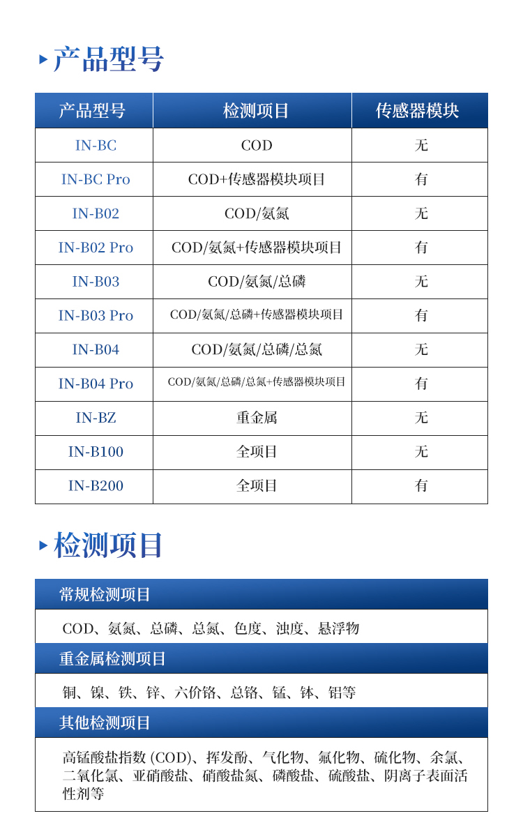 pH传感器、ORP传感器、溶解氧传感器(荧光法)、余氯传感器(恒压法)、电导率传感器、盐度传感器、臭氧传感器、浊度传感器、硬度传感器、悬浮物传感器、污泥浓度传感器、COD传感器、氨氮传感器、叶绿素传感器、蓝绿藻传感器、水中油传感器、CDOM有色可溶性有机物传感器等几十余种;